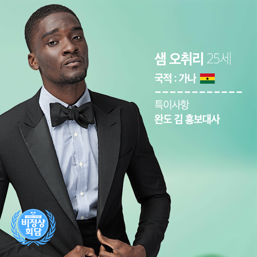 황금거탑에서 연기를 했으며, 가나 장관의 아들로 나옵니다. 첫 등장은 1회 종반부. 거탑 마을에서 농촌업을 익히기 위해 찾아오게 되는데, 한국말도 잘 하는 데다가 싸이로 시작해서 유명한 한국 스타들 및 한국의 지하철 역도 잘 알고 있습니다. 이런 샘에게 제성은 열폭해서 "여기 지하철 없어!"라고 화를 냅니다. 나중에 제성이 마을 사람들에게 소개시켜주기 위해 간 동안 채소 이름을 외우다가 강을 보자 헤엄을 치려고 하는데, 문제는 깊이를 재겠답시고 던진 게 종훈이 운석이라 생각한 데다가 용주→은서→구잘→재우&진욱을 통해 이리 저리 구르게 된 그 돌이었던 것입니다. 결국 이걸 본 재우가 바디 랭귀지로 내려놓으라고 하지만, 그걸 잘못 알아들어서 강변으로 던져버립니다. 그리고 뒤에서 마을 사람들이 자기를 향해 욕하는 걸 모른 체하며 태연하게 가버립니다. 2회부터는 용주와 마찬가지로 종훈의 집에서 지내면서 농촌일을 배우게 되는데, 빌빌 기는 고문관 용주와 다르게 농촌일에 익숙한 면을 보입니다.