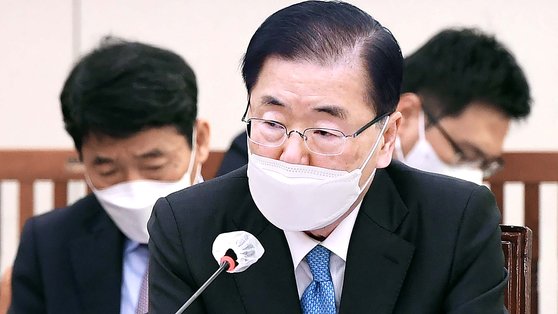 2021년 1월 20일 강경화 장관의 후임으로 제39대 외교부 장관에 내정되었습니다. 미국의 정권교체에 맞추어 정부 내 미국통으로 알려진 인물을 선임했다는 분석입니다. 2월 5열 열린 정 후보자에 대한 인사청문회에서는 문재인 정부의 한반도 비핵화 프로세스 문제 및 북한 원전 건설 추진 문건 논란 등이 도마위에 올랐는데, 당시 정 후보자가 청와대 국가안보실장으로 대북 정책의 한 가운데 서있었기 때문으로 보입니다. 2월 8일 오전, 국회 외교통일위원회에서 제1야당 국민의힘의 반대에도 불구하고 여당 상임위원들을 중심으로 단독으로 청문경과보고서를 채택했고, 당일 문재인 대통령이 임명안을 재가하면서 9일부터 임기를 시작했습니다. .