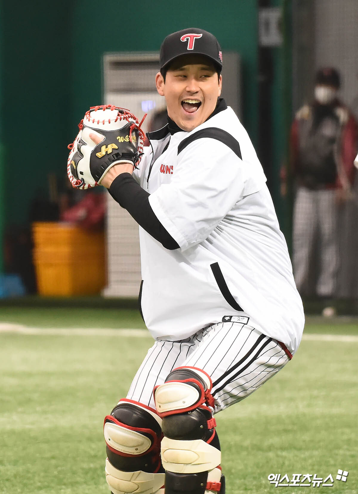 불펜피칭에서 포구하는 기합소리가 매우 파이팅이 넘칩니다. 2020년에도 죽지 않아(4:27 참고)