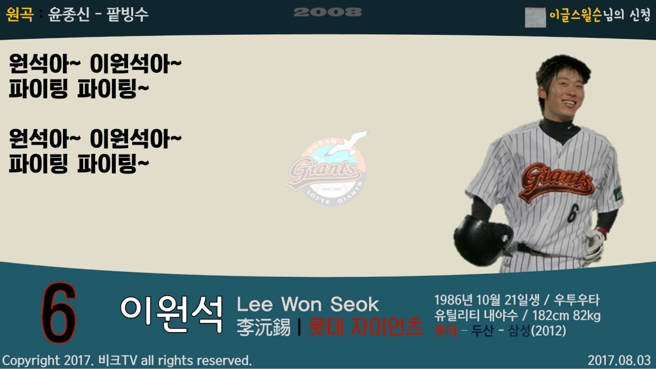 원석아 이원석아 화이팅 화이팅 두산의 이원석 오오오 오오오오 두산의 이원석 오오오 오오오오 두산의 이원석 날려라 두산 이원석 날려라 두산의 이원석 날려라 두산의 이원석 날려라 두산의 이원석 랄라라 랄라 라랄라라 날려라 두산의 이원석 날려라 두산의 이원석 날려라 두산의 이원석 랄라라 랄라 라랄라라 아이패드 mini 광고 BGM. 보험 광고에도 쓰였는데 080~ 500 4949~ 하는 그 노래다. 삼성의 이원석~ 삼성의 이원석~ 안타! 홈런! 오~ 이! 원! 석! x3 삼성의 이원석~ 삼성의 이원석~ 승리를 위하여~ 오~ 이! 원! 석! x2 블루스 사라세노 - If You Believe는 참고만 했지 원곡이 아니라고 했습니다. 그래서인지 채은성의 전 응원가와 느낌이 살짝 비슷합니다. 다린 러프가 빠진 2020 시즌에 1루수 선발 출장이 크게 늘었으며, 2021 시즌 이후로는 오재일이 결장하거나 경기 후반 대주자/대수비로 교체됐다거나 하는 경우에 가끔 1루수를 본다.