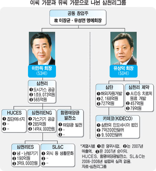 자세한 지배구조는 기사에서 확인 가능한데 보면 알겠지만 법인격으로서 삼천리와 삼탄은 지분관계가 전혀 없습니다. 그러나 공정거래위원회에서 기업집단을 분류할 때는 특수관계인의 지분관계 또한 고려하기 때문에 삼탄은 삼천리그룹에 포함됩니다. 대중에게 알려진 삼천리자전거와는 아무런 관련이 없습니다. 이 유성연, 이장균 회장의 의기투합 과정과 성공스토리가 워낙 극적이라 1985년에 열망이라는 제목으로 KBS 드라마로도 제작 되었는데, 이순재가 유성연, 임동진이 이장균 역을 맡았습니다. 이 두사람이 함경도 출신이라 역시 함경도가 고향인 이순재, 임동진이 캐스팅 됐던 것이라고 합니다. 영상관련내용.