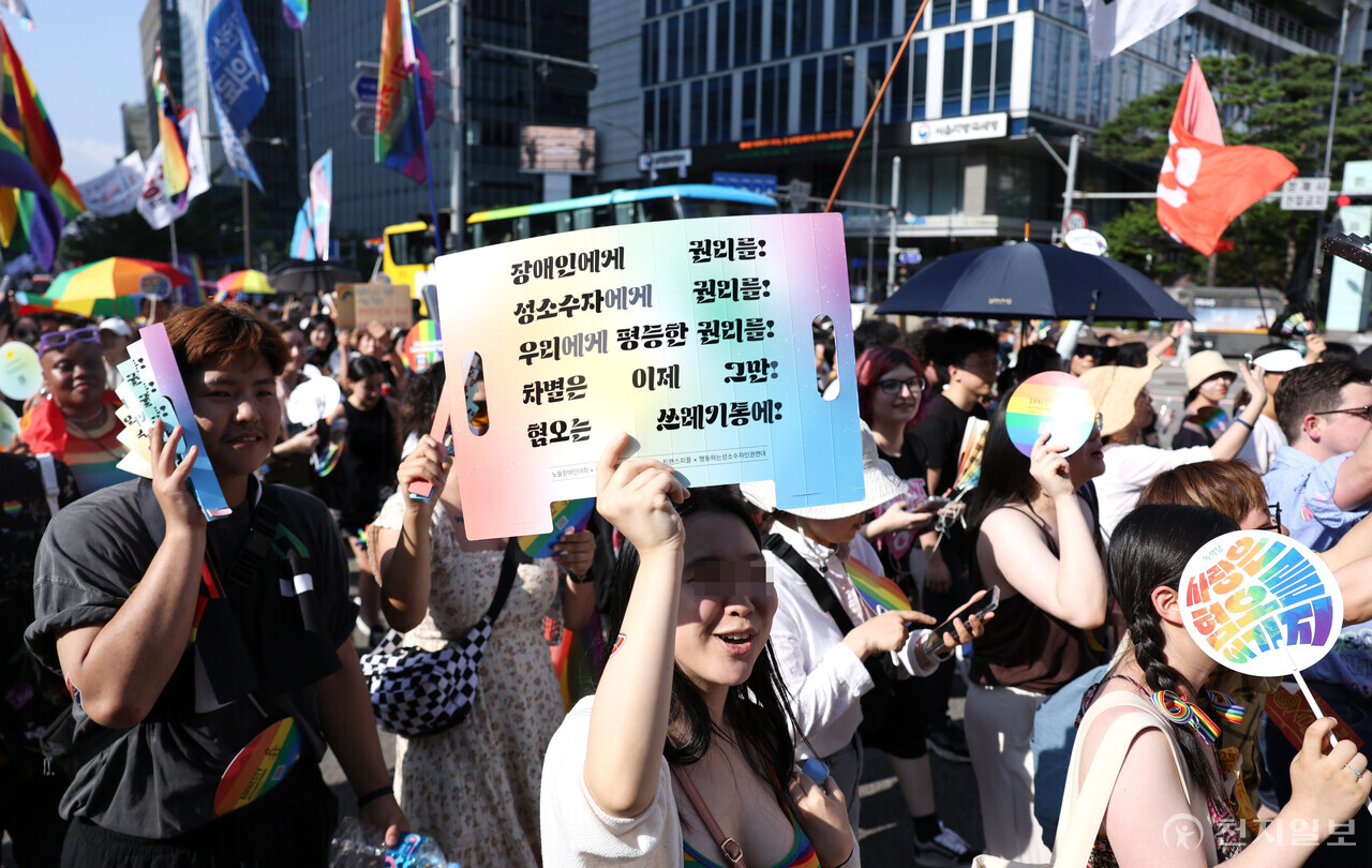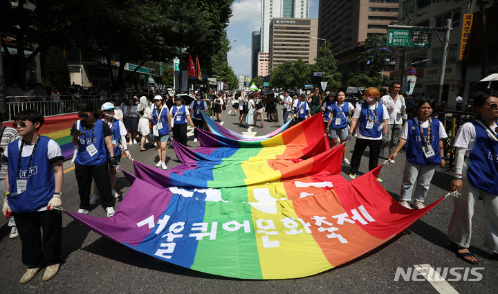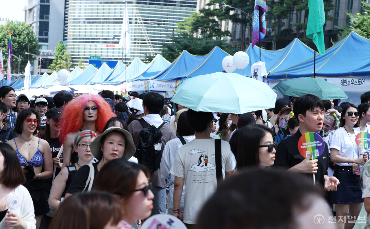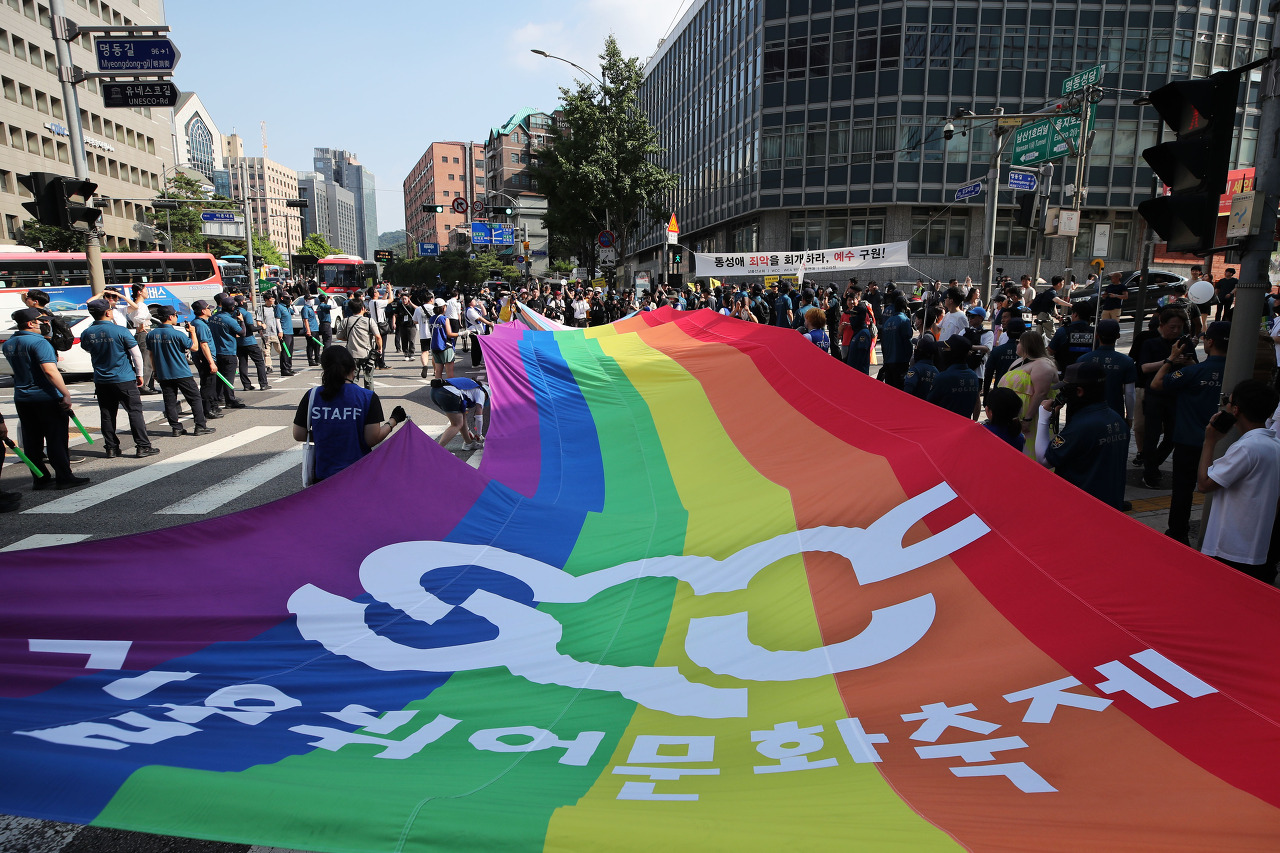 제24회 서울퀴어문화축제는 서울특별시의 서울 시청 앞 광장 사용 금지 조치로 을지로2가에서 진행됐습니다. 2015년 이후 서울광장이 아닌 곳에서 열린 건 이번이 처음입니다. 행사장에는 성소수자와, 연대하는 단체의 부스 50여 개가 설치됐는데 미국·영국·캐나다 대사관 등도 참여했으며 각국 대사들은 응원 메시지도 보내왔습니다. 주최 측은 을지로 일대에 약 15만 명이 모였다고 추산했습니다. 5만여 명의 참가자들은 을지로에서 시작해 명동역을 지나 서울광장까지 행진했습니다. 1 2 3 4 한편 바로 인근에서 종교단체와 보수단체의 퀴어축제 반대 집회도 동시에 열렸습니다. 경찰은 50개 부대 3천여 명을 투입해 퀴어축제 행사장에 펜스를 설치하고 집회단체들 간의 동선을 분리한 덕에 별다른 충돌 없이 마무리됐습니다. .