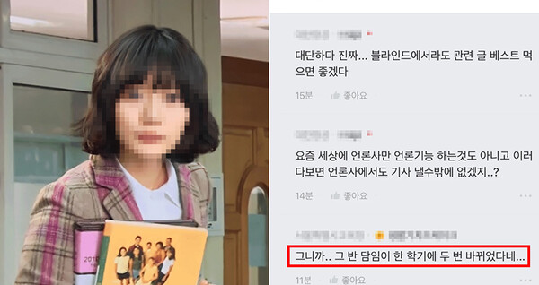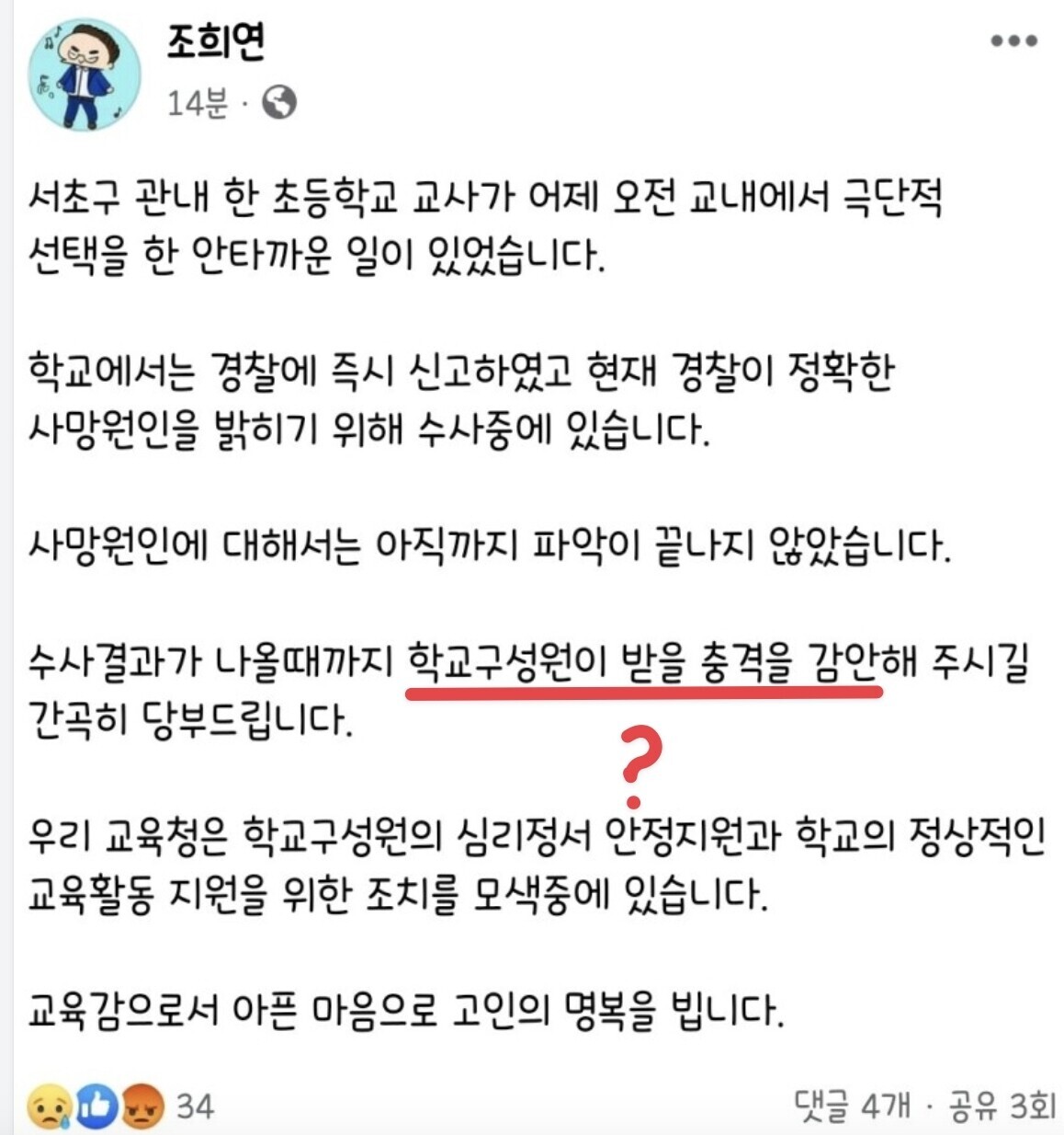 블라인드에는 학부모의 집안에 높으신 분이 있다는 이유로 해당 학교와 학교장, 해당 교육청이 이 사건을 교사의 개인사로 인한 사건으로 치부하며 고의적으로 덮으려고 한다는 글까지 올라와 각종 커뮤니티에서 화제가 되고 있습니다.
