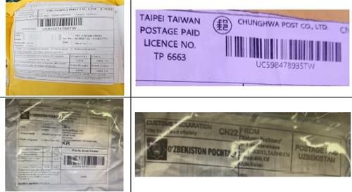 우편물의 발송지는 대부분이 대만이며, 일부 우편은 중국에서 발송되어 대만을 경유하는 우편도 발견되고 있습니다.