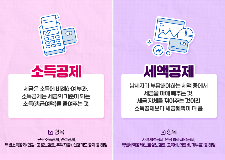 쉽게 말하면 근로자들이 신고를 잘 할 수 있을지 모르겠고, 세금 안 내고 도망가는 사람이 있을 수도 있으니, 미리 월급 줄 때마다 일정액을 떼고 준 다음 나중에 정확히 계산해서 더 걷었으면 돌려주고 덜 걷었으면 그만큼 더 떼는 것입니다. 현실적으로는 내수경기를 활성화하고자 하는 목적도 있습니다. 제도상 현금영수증 및 카드내역을 확인해서 세금을 환급시켜주는 신용카드 등 세액공제가 있고, 원천징수 자체도 평균보다 좀 많이 징수하여, 이듬해 환급 시 공돈으로 인식하게 하도록 유도하는 측면이 있습니다. 이는 사실 국민들이 어느 정도 조삼모사를 부추기는 면도 있습니다. 이론으로는 원천징수를 적게 하고 다음 해에 더 걷는 게 납세자에게 이익이지만, 한 해 정도 이렇게 해 보니 바로 세금폭탄론이 등장하며 여론이 안 좋아지기 때문입니다. 의료비, 교육비, 월세 등 생존을 위해 필수불가결한 비용이나 연금보험료, 기부금 등 정책으로 장려할 만한 지출은 추가 소득공제, 또는 세액공제의 대상이 됩니다.