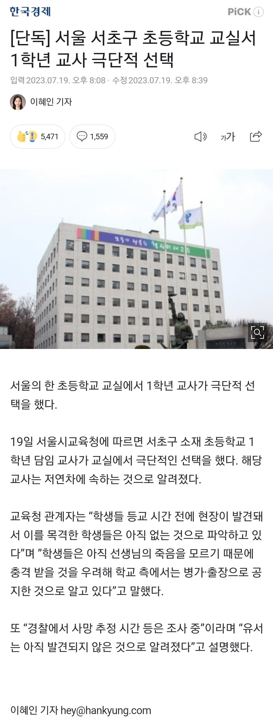 - 서울 서초구 초등학교 교실서 1학년 교사 극단적 선택, 한국경제, 2023-07-19
